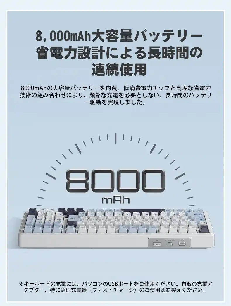 「F99」JIS配列モデルは、フルサイズレイアウト、大容量バッテリー、そして日本向けのローカライズを融合させることで、効率的なタイピング環境を提供し、日本のユーザーにとって頼れるキーボードの選択肢となります。 |