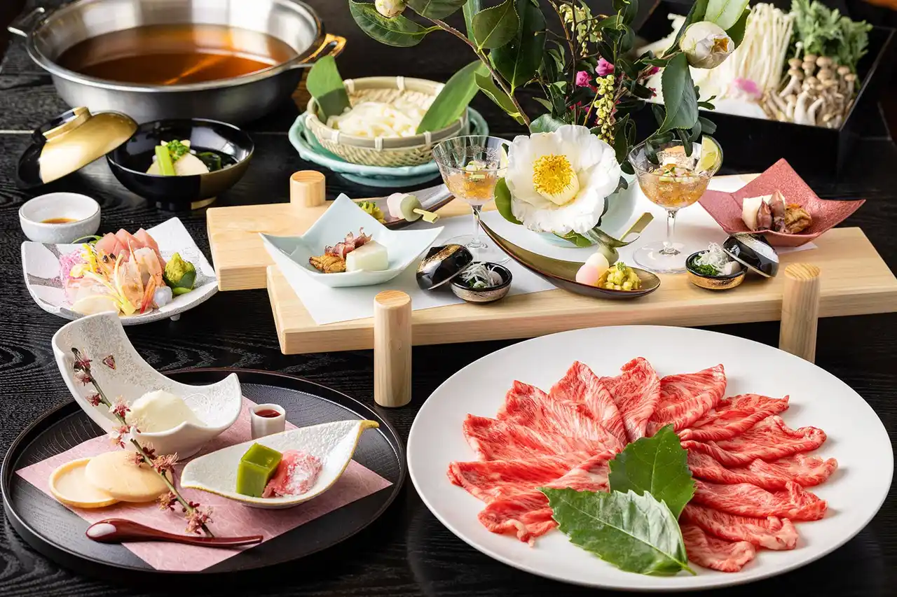ご夕食には、メインに鹿児島県産A5ランク黒毛和牛によるすきやき、またはしゃぶしゃぶからお好みで選べる季節の和会席をご用意いたします。また、お料理に合わせて厳選した地酒やウイスキー、ワインなどのアルコールも豊富にラインナップ。季節それぞれのマリアージュに舌鼓を打つ、上質なディナータイムをご堪能ください。 |