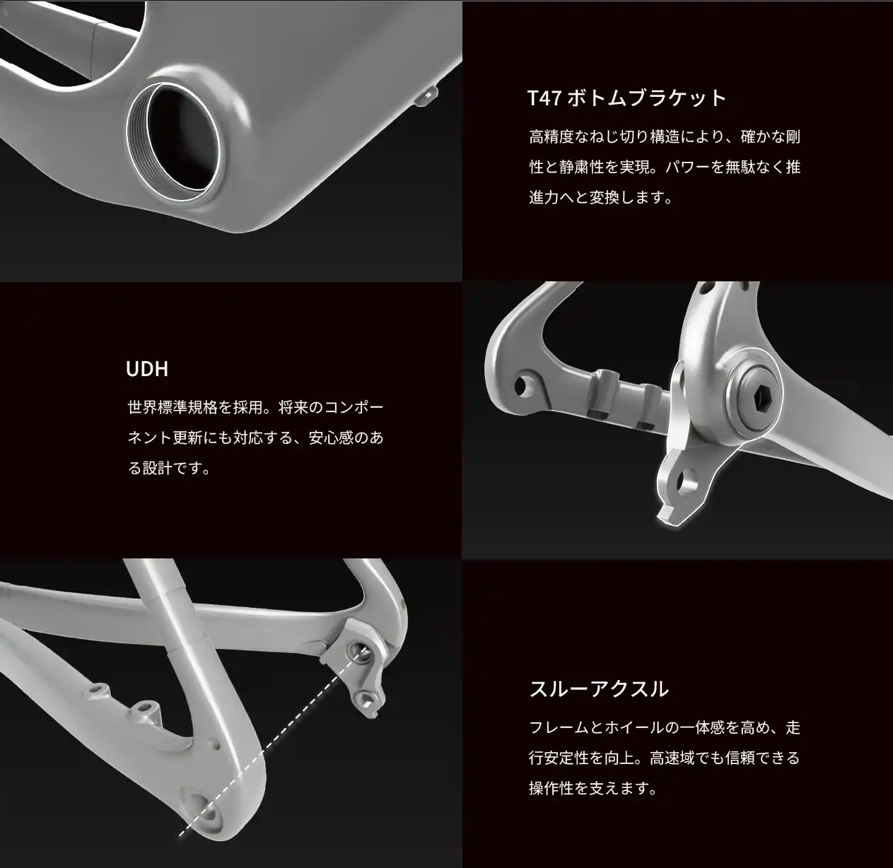 モーター起点ではなく、まずスポーツバイクとして理想的なフレームを設計。 T47、UDH、スルーアクスルなどの規格を採用し、走行性能と整備性の両立を目指しました。 |