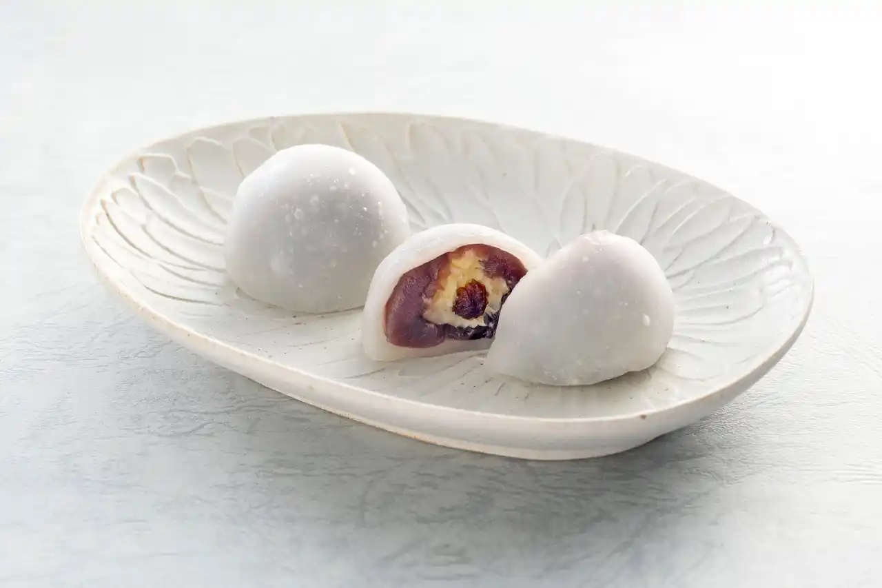 ラム酒に漬け込んだレーズンに、クリームチーズとバターを合わせ、やわらかな求肥で包んだ大福です。 |