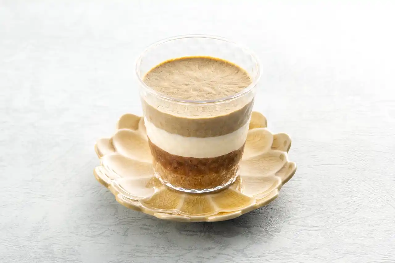 コーヒーをふくませたスポンジにつぶあんを重ね、ほうじ茶が香るチーズクリームを合わせました。レーズンをしのばせることで、香ばしさの中にふわりと甘酸っぱさが広がり、後味に奥ゆきが生まれました。 |