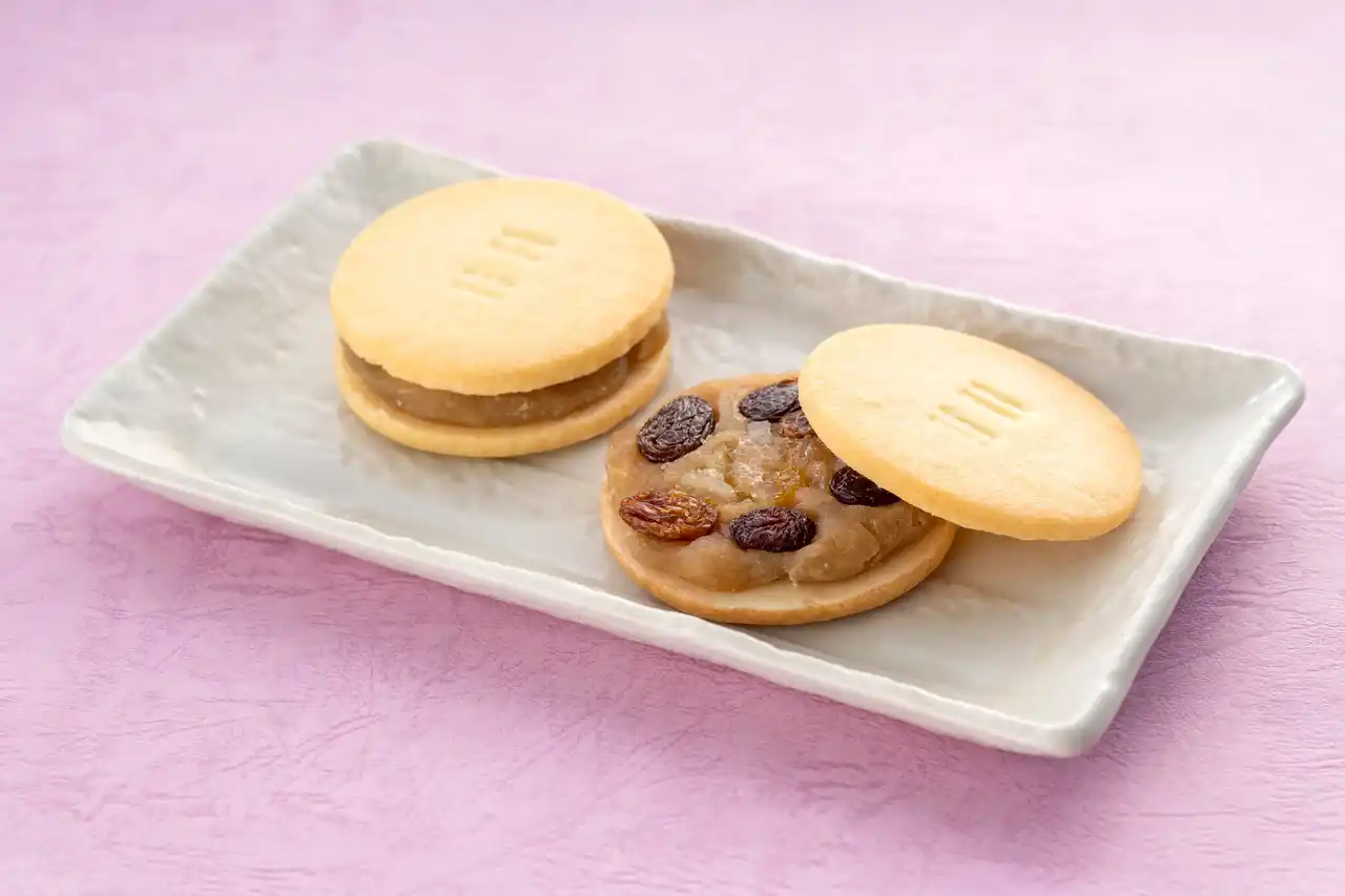 チーズサブレにチョコレートと白雪大納言小豆餡を重ね、ラム酒漬けレーズンとレモンピールを合わせました。 |
