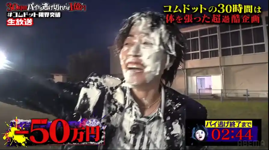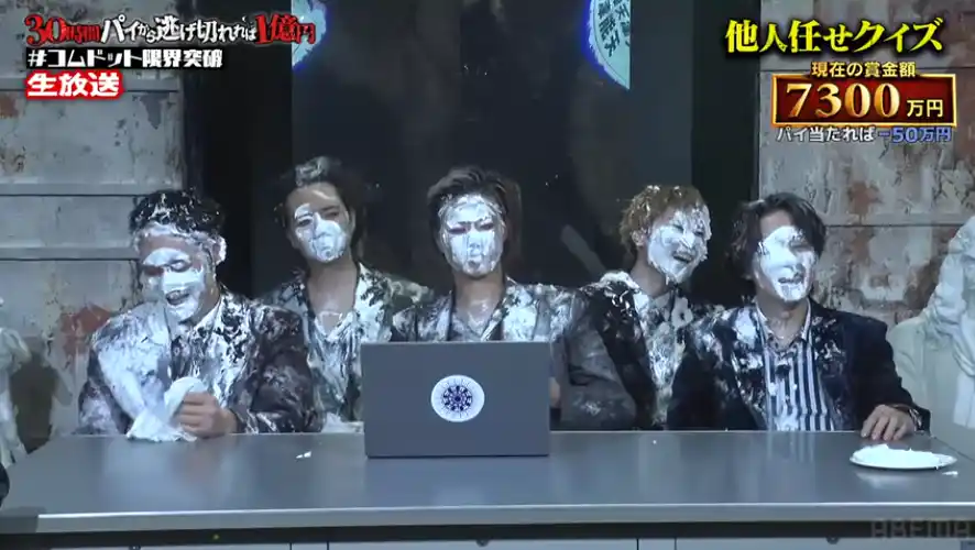 『コムドット 30時間パイから逃げ切れれば1億円!』は、5人組動画クリエイター・コムドットが最大1億円の賞金をかけ、30時間連続で襲いかかるミッションに挑戦する大規模バラエティ特別番組です。ミッションをクリアし続ければ1億円を全額獲得できますが、失敗するたびにクリーム砲やパイ投げの罰ゲームを受け、賞金が減額されていきます。 |
