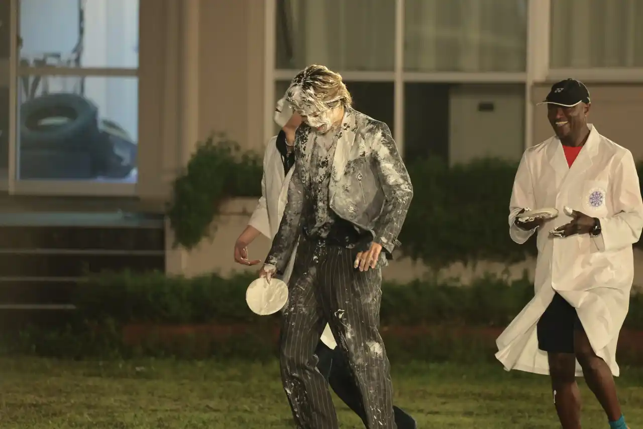 番組の幕開けとともに、舞台となる校庭に姿を現したコムドットの5人。リーダーのやまとは「1億円に目が眩んだ」と率直な野心を口にします。「パイから逃げ切ってください」というアナウンスが流れると、白装束に身を包んだパイ投げ集団が襲来。異様な緊張感が漂う中、10分間の過酷なサバイバルゲームが開始されました。今回のルールは、パイを1発受けるごとに賞金が50万円減額されるという厳しいもの。開始直後から集団の猛攻を受け、まずはひゅうがが捕獲されると、至近距離から「パイ・バズーカ」の直撃を見舞われます。