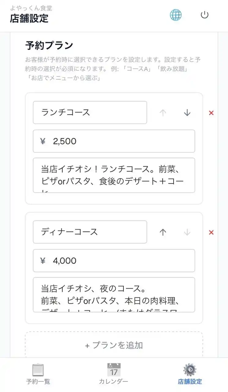 自動予約用のプラン設定です。予約受付時にお客様のプランを前もって確認できます。アラカルト?コース? |