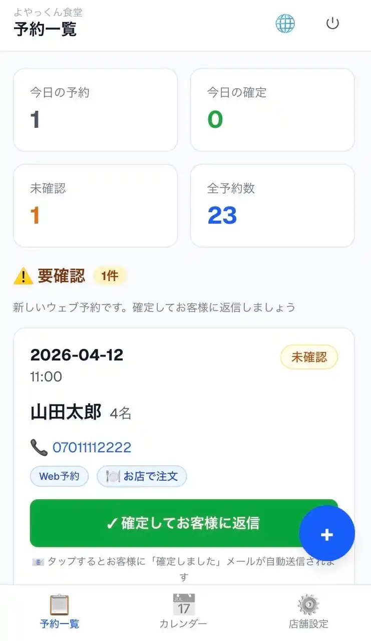 ・ワンタップ確定+自動返信メール:予約をワンタップで確定、お客様に確定メールを自動送信 |