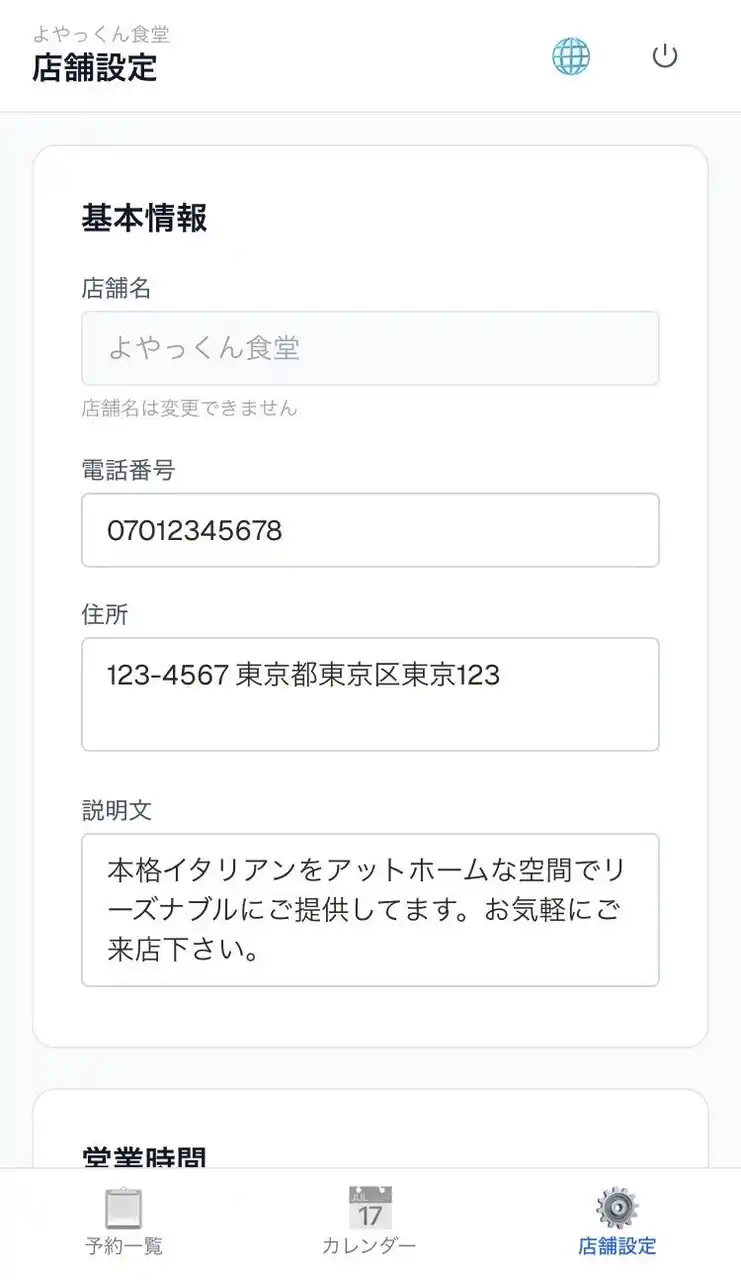 あなたが入力した店舗情報がこちらにアップされます。営業時間の変更はここで可能です。 |