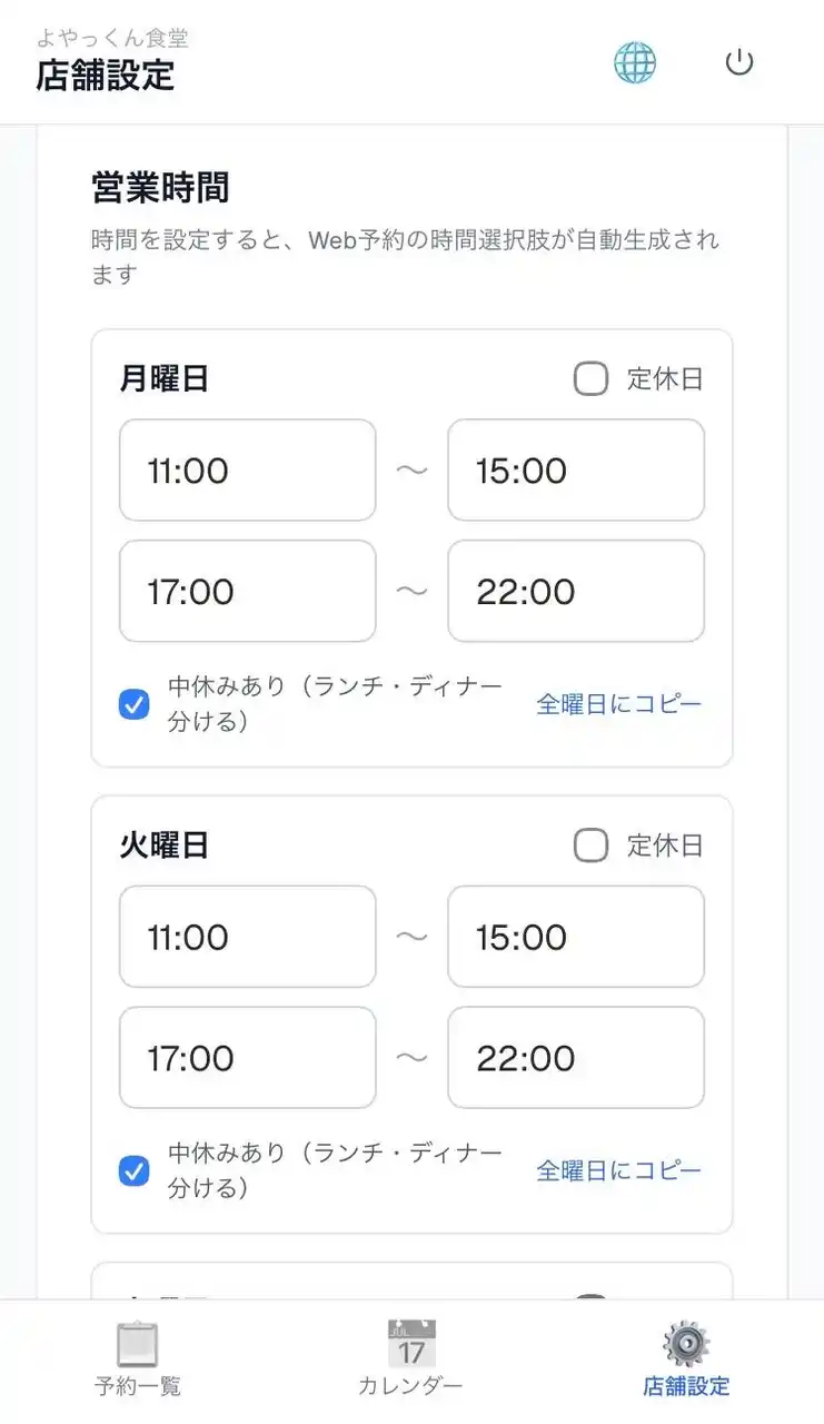 お店の営業時間を入力。中休み(アイドルタイム)対応。月曜日のみ入力、全曜日にコピーをタップすれば月~日曜日まで一括入力。定休日もワンタップで入力可能。 |