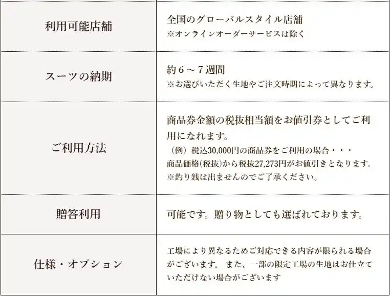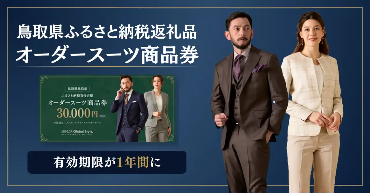 オーダースーツ専門店「グローバルスタイル」を運営するグローバルスタイル株式会社(東京証券取引所 スタンダード市場:7126、本社:大阪市中央区、代表取締役社長 田城弘志)が、鳥取市のふるさと納税返礼品として取り扱う「オーダースーツ商品券」の有効期限を変更しました。 2026年4月以降のご注文分より、有効期限は従来の半年間から1年間へと変更され、より余裕をもってご利用いただけるようになりました。なお、2026年3月までにご注文いただいたオーダースーツ商品券の有効期限は従来通り半年間となります。 |