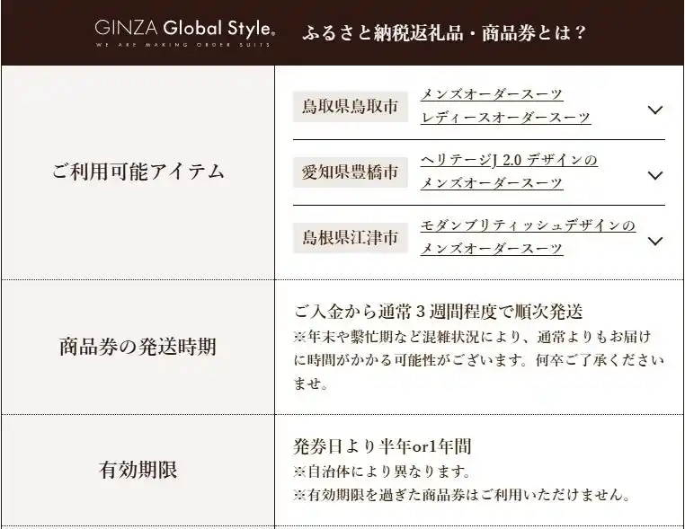 グローバルスタイルのふるさと納税の返礼品では、鳥取県鳥取市の他に愛知県豊橋市、島根県江津市の各自治体にて、グローバルスタイル全店で利用可能な「オーダースーツ商品券」をご用意しております。 |