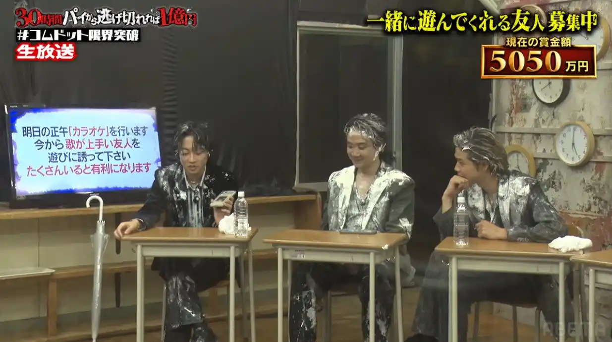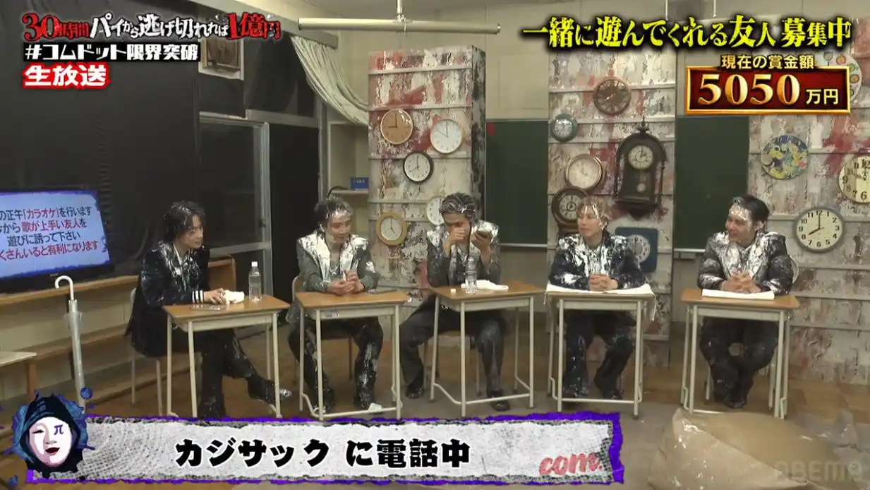 『コムドット 30時間パイから逃げ切れれば1億円!』は、5人組動画クリエイター・コムドットが最大1億円の賞金をかけ、30時間連続で襲いかかるミッションに挑戦する大規模バラエティ特別番組です。ミッションをクリアし続ければ1億円を全額獲得できますが、失敗するたびにクリーム砲やパイ投げの罰ゲームを受け、賞金が減額されていきます。 |