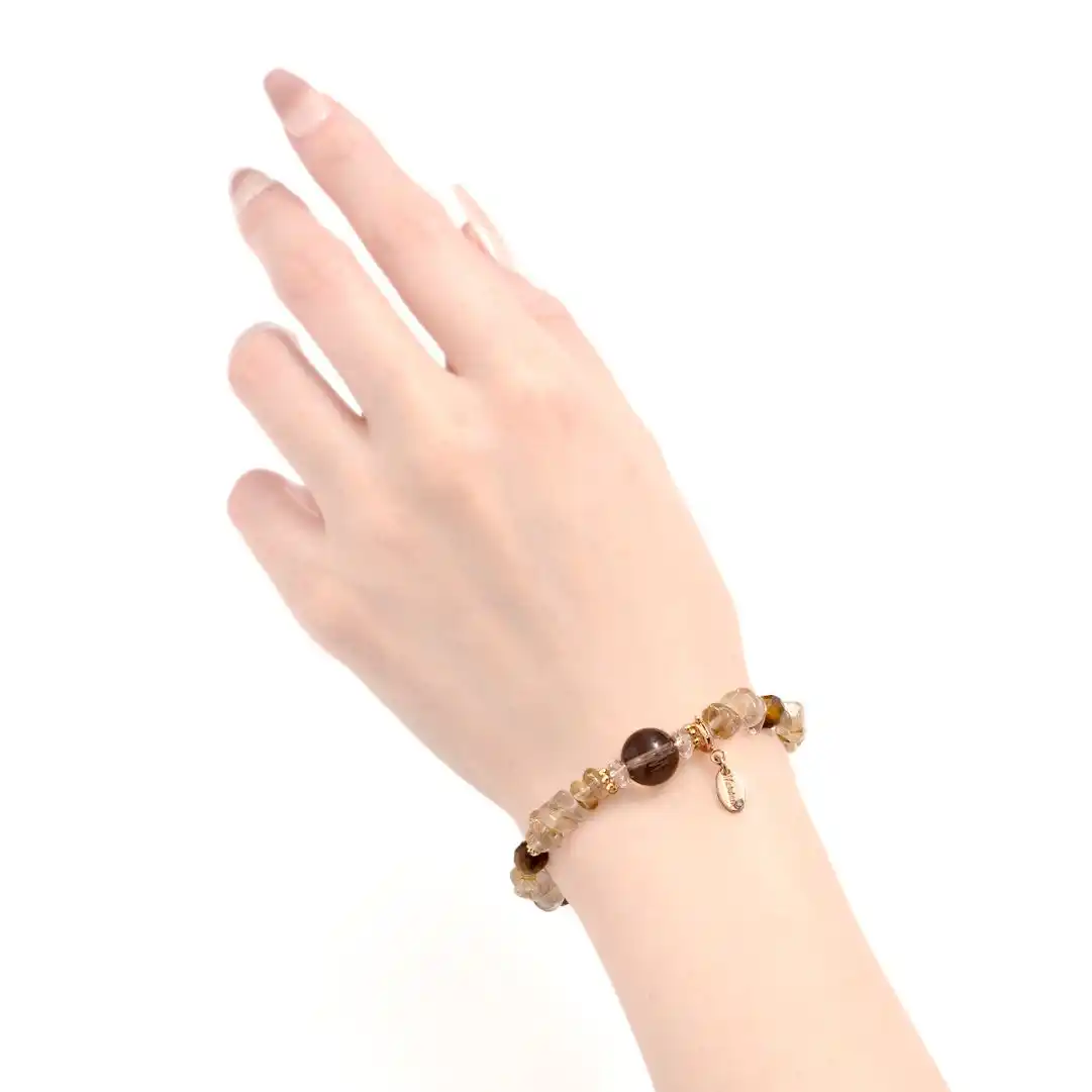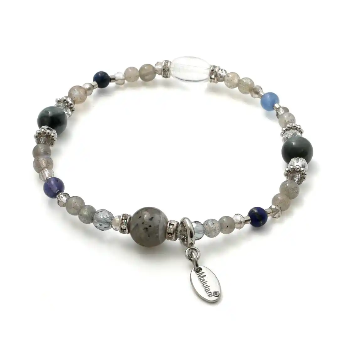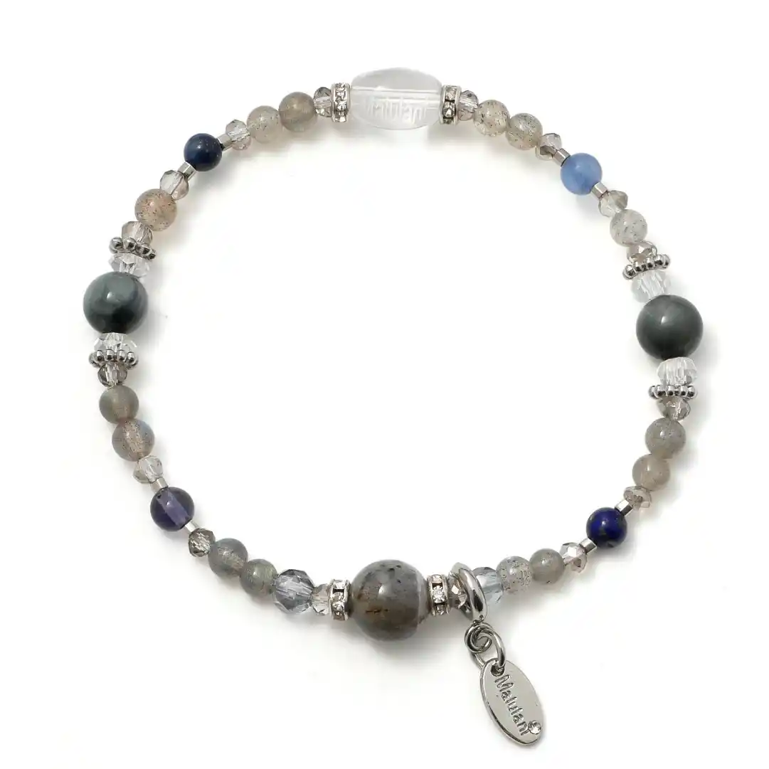| さらに、未来を見通す力の象徴とされるアイオライト、物事の本質を見抜くといわれるイーグルアイ、幻想的な光を放つシルバーオーラ、輝きを引き立てるカット水晶などを配置し、洗練された存在感のあるブレスレットに仕上げています。 | ||||||||||||||||||||||