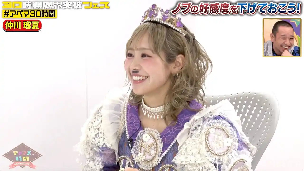 | 『30時間限界突破フェス』内にて放送した『「チャンスの時間」ノブの好感度を下げておこう30時間フェスver.』は、ノブが不祥事を起こす前に、上がりすぎた好感度をあらかじめ下げて不測の事態に備える『チャンスの時間』の人気企画です。大悟の指示で“イヤな奴”になりきったノブが、楽屋挨拶に訪れるゲストに対して“好感度落下チャレンジ”を行い、今回、相手役として大人気アイドルグループ・FRUITS ZIPPERの仲川瑠夏と、俳優・山本裕典が登場しました。 | |||||||||
