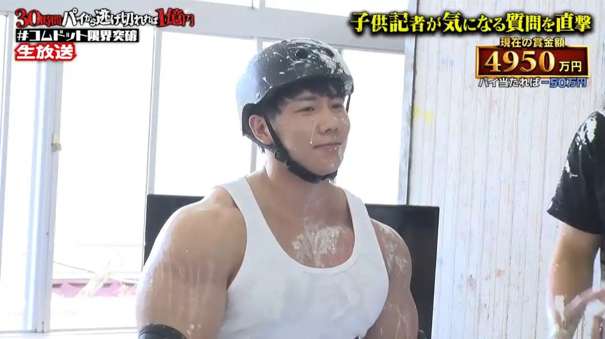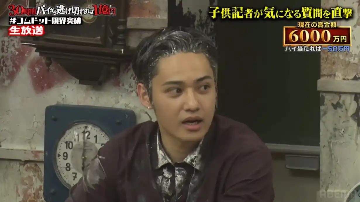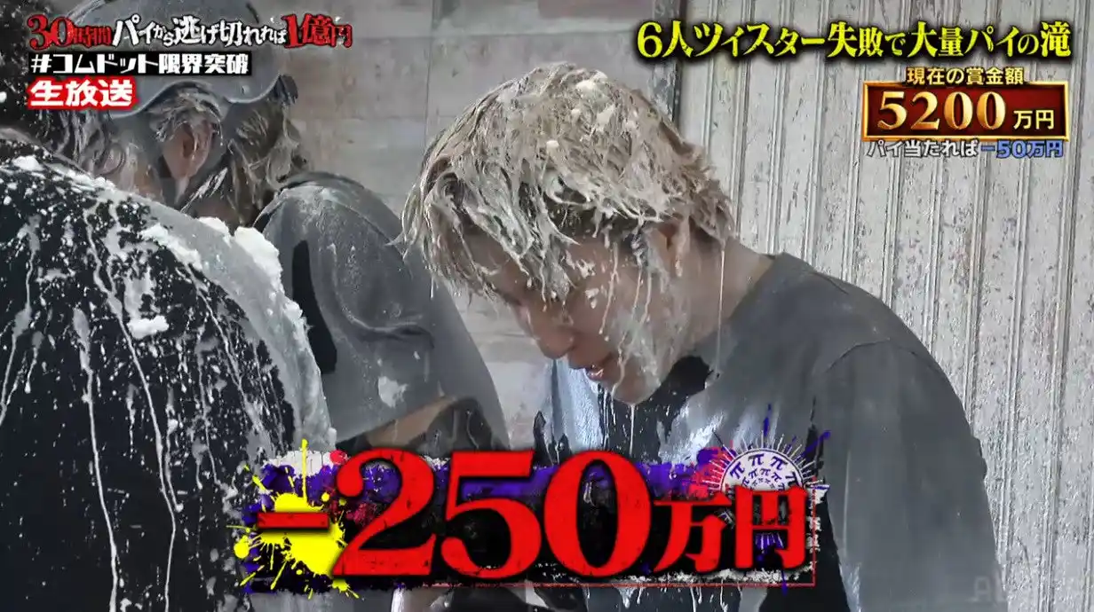 『コムドット 30時間パイから逃げ切れれば1億円!』は、5人組動画クリエイター・コムドットが最大1億円の賞金をかけ、30時間連続で襲いかかるミッションに挑戦する大規模バラエティ特別番組です。ミッションをクリアし続ければ1億円を全額獲得できますが、失敗するたびにクリーム砲やパイ投げの罰ゲームを受け、賞金が減額されていきます。 |