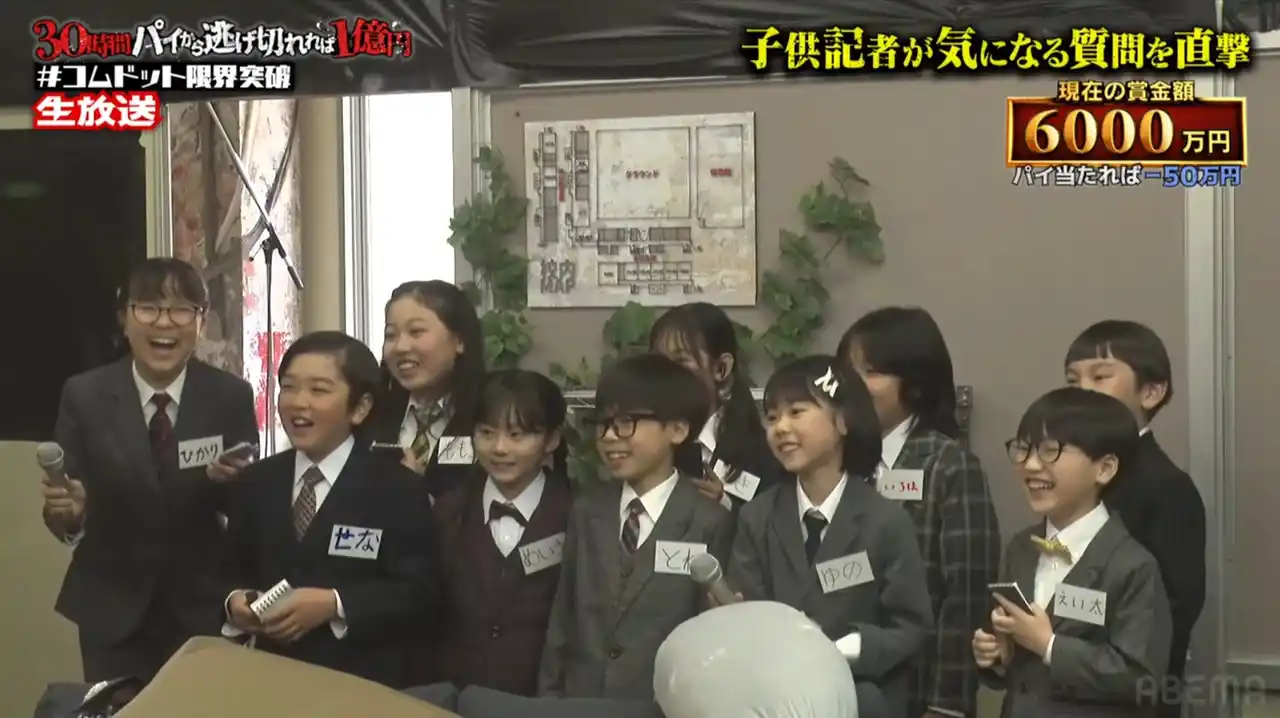 そこへ再び子ども記者たちが現れ、第2回記者会見が開幕。記者から「この体を作るために借金をしたのは本当か」と問われた横川は、「おじさんはいっぱいお金を借りてるの。500万くらいかな」と衝撃の事実を告白。さらに最高月収を「1000万くらい」と明かすも、「(借金は)それでも返さないよ。おじさんは逃げ切ろうと思ってる」と破天荒な宣言を放ち、これにはコムドットも「めちゃくちゃ言ってるよ!」と猛ツッコミ。現場は大きな笑いに包まれました。