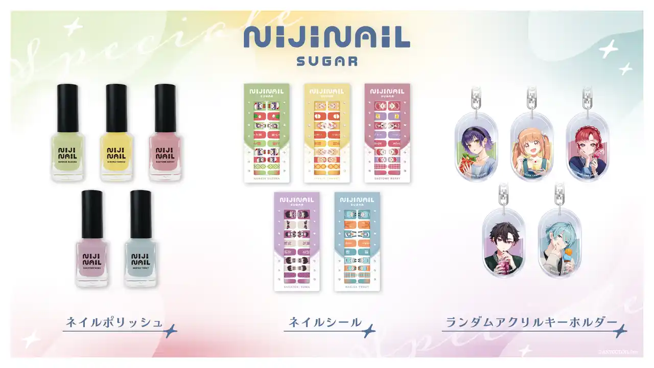 VTuberグループ「にじさんじ」所属の七瀬すず菜、早乙女ベリー、雲母たまこ、酒寄颯馬、渚トラウト5名によるユニット「Speciale」の「にじネイル Sugar」グッズが登場! |