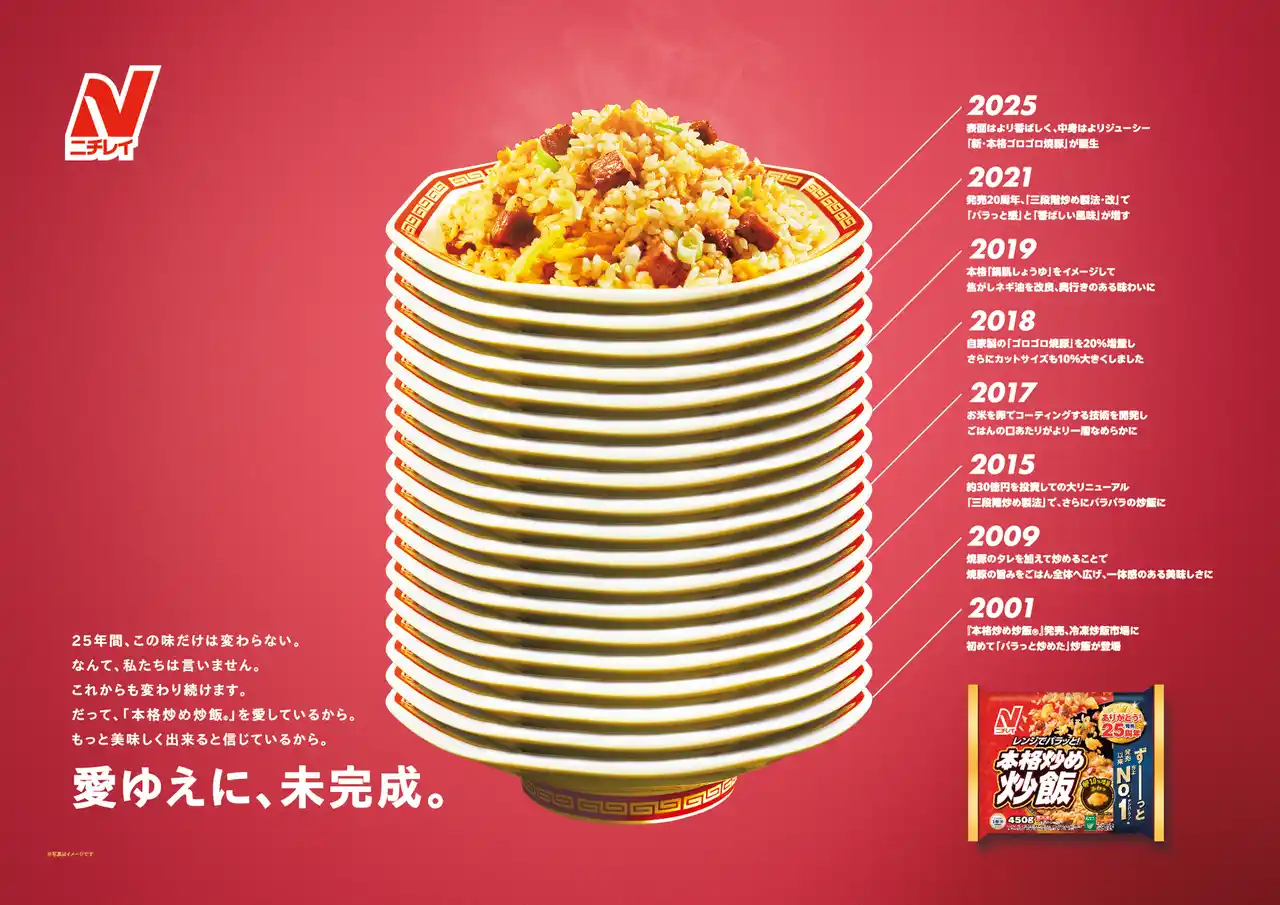 ニチレイ『本格炒め炒飯(R)』はおかげさまで「25年連続売上No.1(※1)」および「2025年の冷凍食品全体における購買金額No.1(※2)」を達成いたしました。これまで多くの生活者にご愛顧いただいたことへの感謝を届けるべく、『本格炒め炒飯(R)』の25年間の歴史と進化を体感できる特別仕様車両を運行いたします。 |