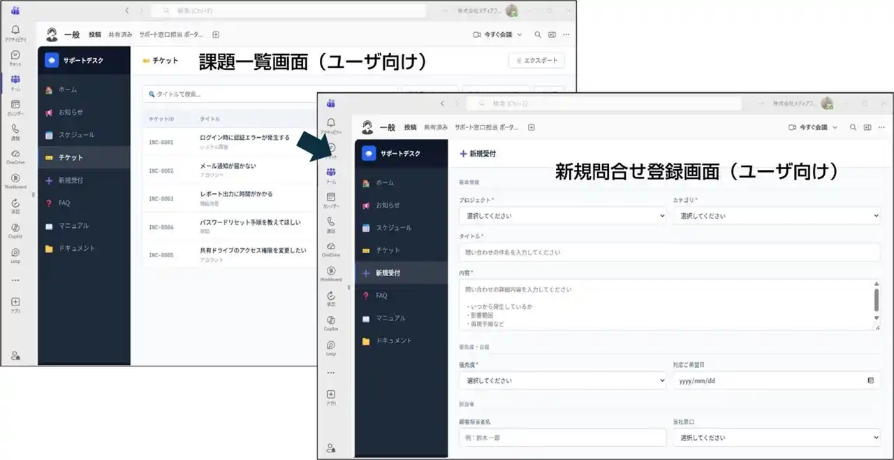 本システムはMicrosoft 365環境上で稼働し、顧客とのやり取り・進捗共有、担当割り当て、ステータス管理、作業時間管理などのサポート業務をTeams中心に標準化します。企業に普及しているTeamsを基盤に顧客との情報共有を円滑化します。 |