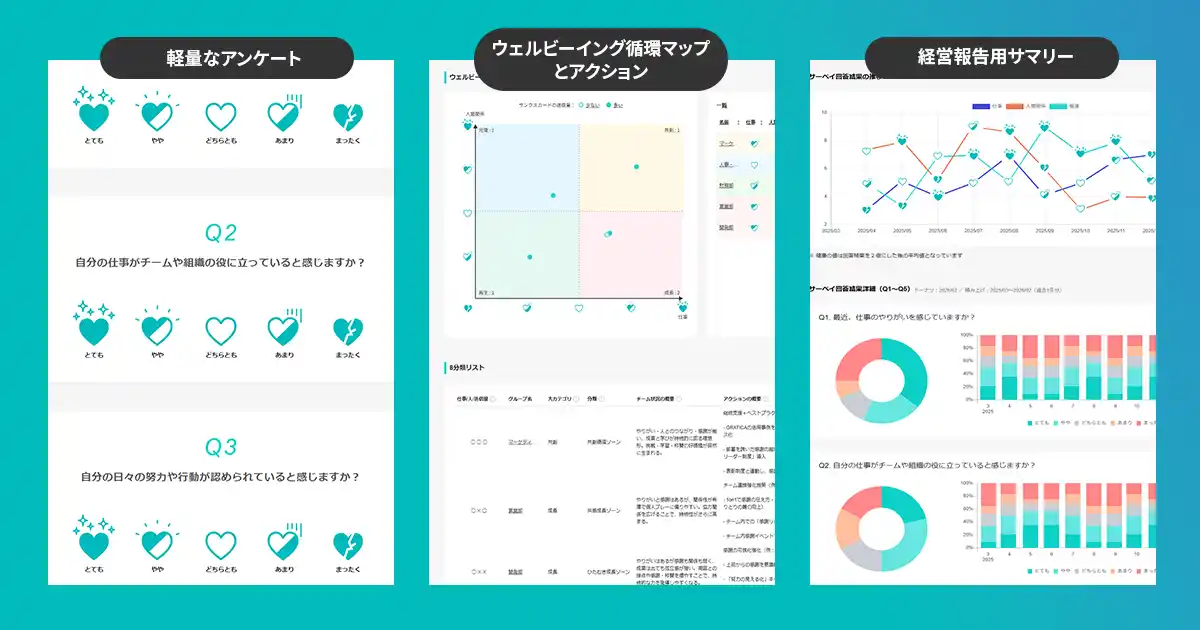 | 私たちが描く「組織サーベイ」は、単に組織の状態を把握するためのものではありません。GRATICAに蓄積された感謝データと毎月5問の軽量サーベイを掛け合わせることで、組織の変化を見える形にし、現場では対話や改善アクションに、経営層には報告や判断に活用できるよう設計しています。 | |||||||||||||||