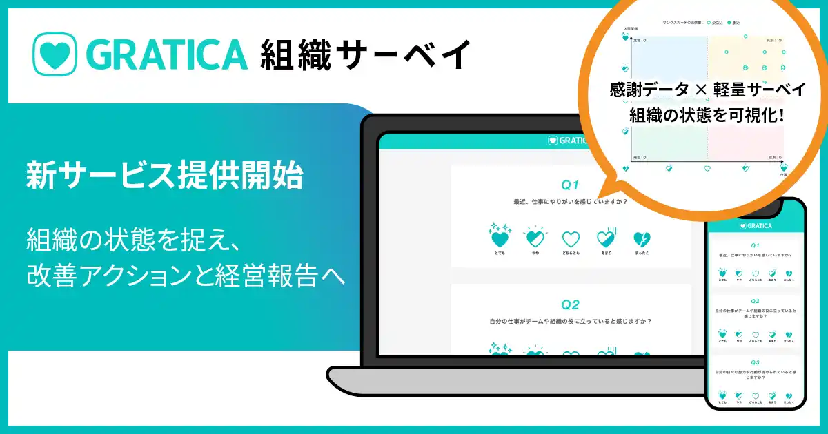 私たちは、日常の中にすでに多くの「ありがとう」が存在していると考えています。 職場での助け合いや支え合いの中で生まれる感謝は、組織にとって大切な価値である一方、当たり前の出来事として見過ごされやすいものでもあります。 GRATICAは、そうした日常の感謝を蓄積し、可視化することで、組織の中にある支え合いや貢献、関係性の変化に向き合ってきました。 その過程で見えてきたのは、「感謝の循環」が職場の対話や信頼関係に影響を与えているということです。 ただ、サンクスカードのやり取りだけでは、そうした変化を通じて今、組織がどのような状態にあるのか、また次にどのような対話や改善アクションが必要なのかまでは把握しにくいという課題がありました。 私たちは、こうした変化を組織の状態として可視化し、対話や改善アクションにつなげるため、感謝データと軽量サーベイを組み合わせたGRATICAの新サービス「組織サーベイ」を開発しました。 |