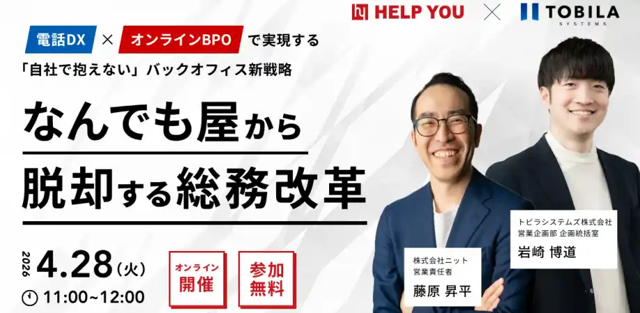 このたび、2026年4月28日(火)、トビラシステムズ株式会社(以下、トビラシステムズ)と共催で無料オンラインセミナー『「なんでも屋」から脱却する総務改革 ~電話DX×オンラインBPOで実現する「自社で抱えない」バックオフィス新戦略~』を開催いたします。