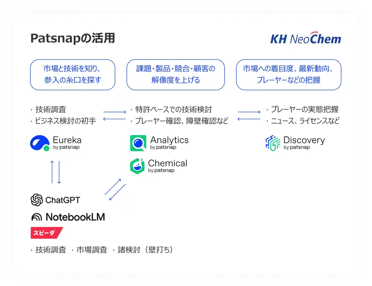 KHネオケム株式会社では、Patsnap Eureka、Patsnap Analytics、Patsnap Discoveryなどの製品を連携して活用することで、アイデア創出から検証、分析、提案まで、各プロセスの効率化を実現しています。 |