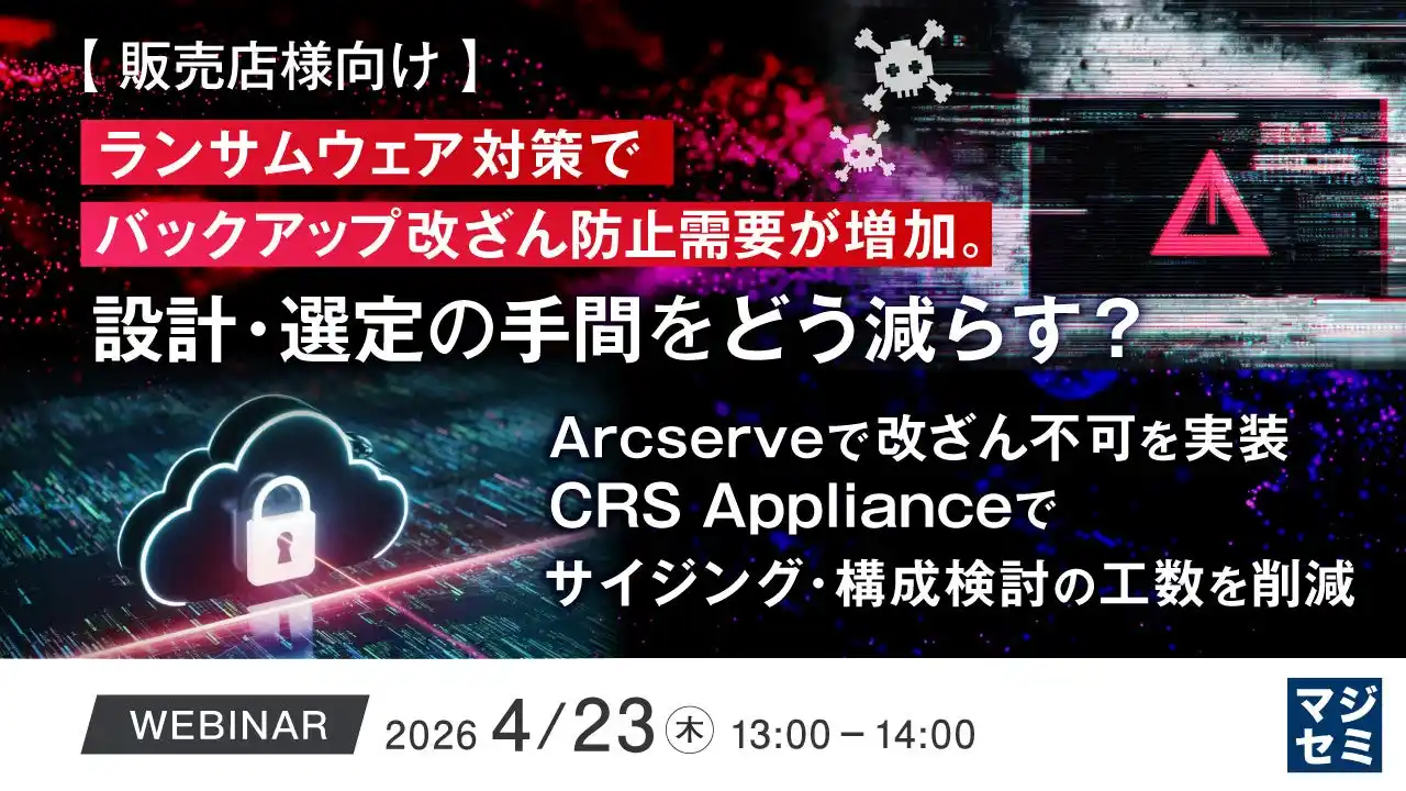 | マジセミ株式会社は「【販売店様向け】ランサムウェア対策でバックアップ改ざん防止需要が増加。設計・選定の手間をどう減らす?」というテーマのウェビナーを開催します。 |