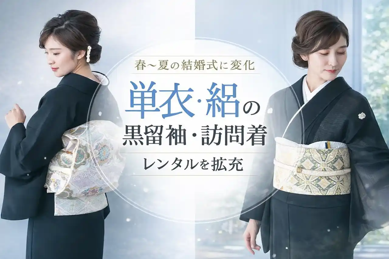 近年、春~夏にかけての結婚式や式典の増加に伴い、「暑さ対策」を意識した着物選びのニーズが高まっています。 レンタル衣裳マイセレクト(運営:株式会社LIN/岐阜県可児市)は、こうした需要の変化に対応し、単衣の黒留袖および訪問着のラインナップを2026年4月に拡充いたしました。 |