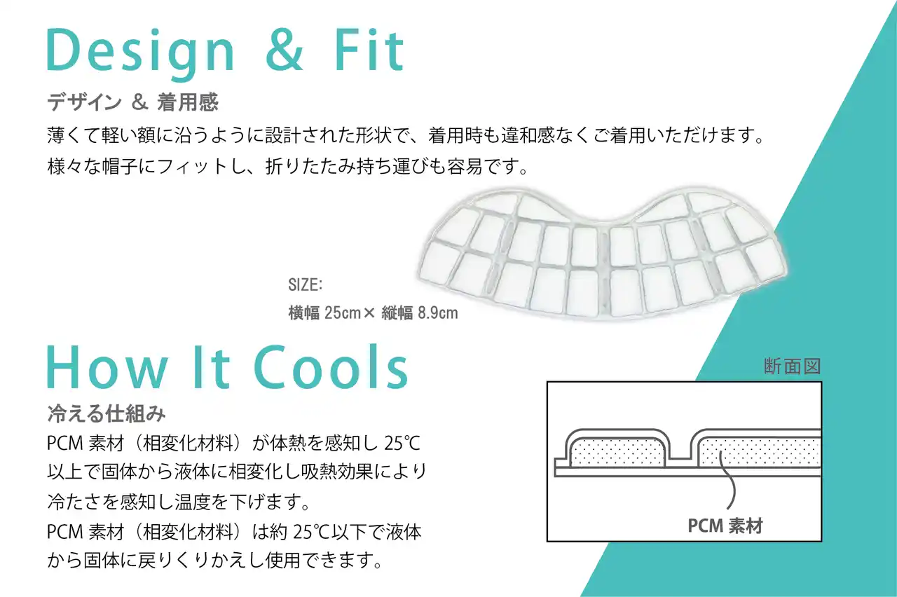 株式会社キャップスは、熱中症対策として注目されるPCM素材を採用した帽子専用クールパッドを発売します。 大人から子どもまで幅広い帽子にフィットする独自形状と、肌に心地よく沿うブロック構造(特許第7790796号)を採用し、帽子メーカーならではの快適性を実現しました。 氷や水を使わず繰り返し使える新発想の冷却アイテムとして、夏場の外出・スポーツ・通勤・アウトドアなど、さまざまなシーンで帽子内部の温度環境を快適に保ちます。 |