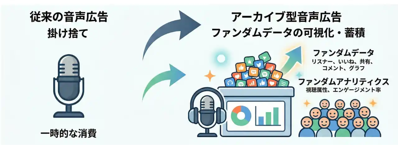 ・ストック型で好意を醸成:放送された広告は「音声CMチャンネル」にアーカイブされます 。一過性の“掛け捨て”で終わるのではなく、作品として長く聴き続けられることで、企業への好意に変換され続ける新しい広告体験を提供します 。 |