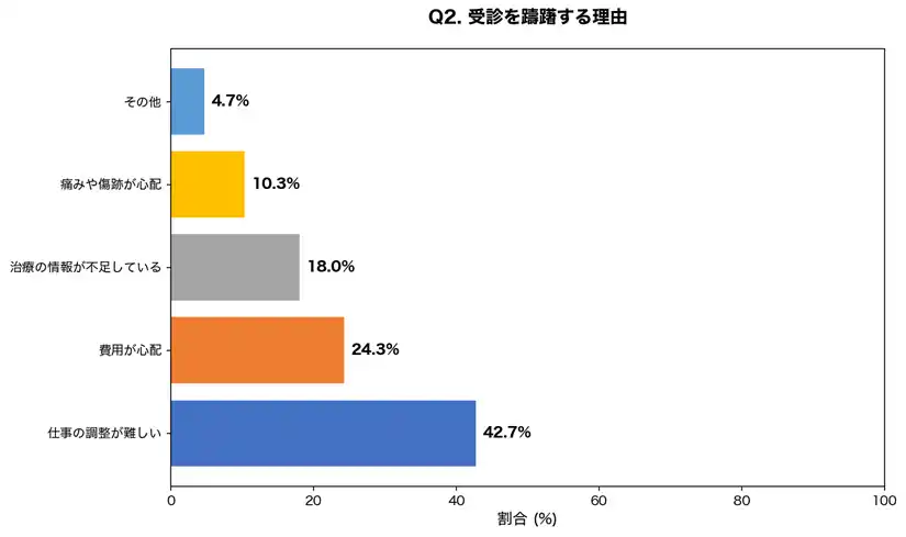 | 受診を妨げる「3つの障壁」として、仕事の調整(42.7%)、費用面の不安(24.3%)、情報不足(18.0%)が上位を占めた。これらの障壁を解消する適切な情報提供が、潜在的な治療ニーズの顕在化につながると考えられる。 | ||||||||||||||||||||||||||||||