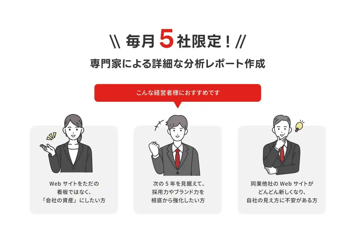 自社でWebサイトをお持ちの企業様であれば、現状のリスク把握から、採用・集客への活かし方まで、今後の事業成長に役立つ有益な情報を得ることが出来ます。 |