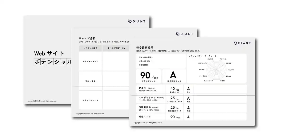 株式会社DIANTは、こうした「もったいない」機会損失を防ぎ、既存のWebサイトが本来持っているポテンシャルを引き出すため、自社の現状を正しく把握できる本診断サービスを開発しました。 |