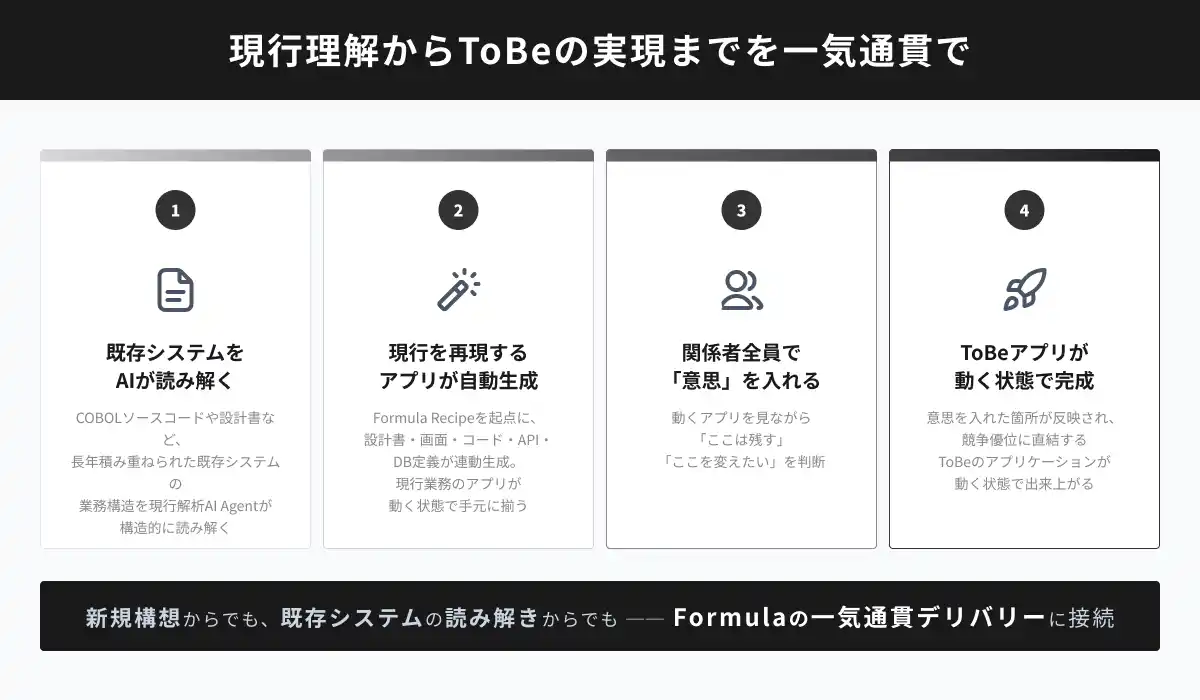 今回Formulaに搭載した解析AIは、メインフレーム上のCOBOLを含む既存システムに積み重ねられた業務の知恵を読み解き、Formula Recipeとして構造化します。そこから設計書やアプリケーションが自動で立ち上がるため、業務部門もIT部門も「今の業務がこうなっている」という実感を共有した上で、「ここを変えたい」という意思を入れるだけで、ToBeの姿が動く形で目の前に現れます。 |