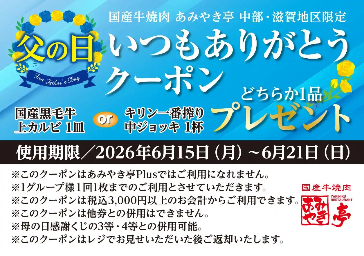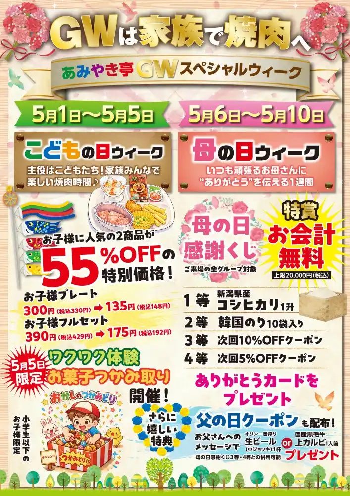 ・こどもの日ウィーク:2026年5月1日(金)~5月5日(火) ・母の日ウィーク:2026年5月6日(水)~5月10日(日) ・実施店舗:あみやき亭中部 各店 |