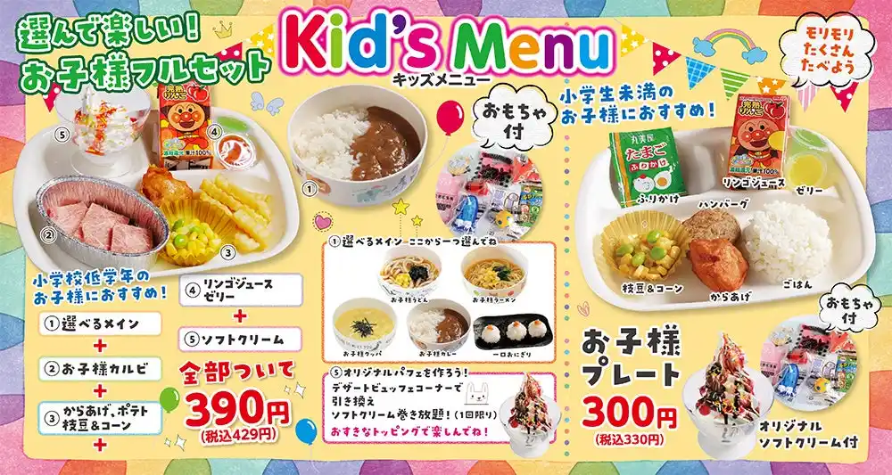 ・お子様プレート 通常300円(税込330円) → 135円(税込148円) ・お子様フルセット 通常390円 (税込429円)→ 175円(税込192円)