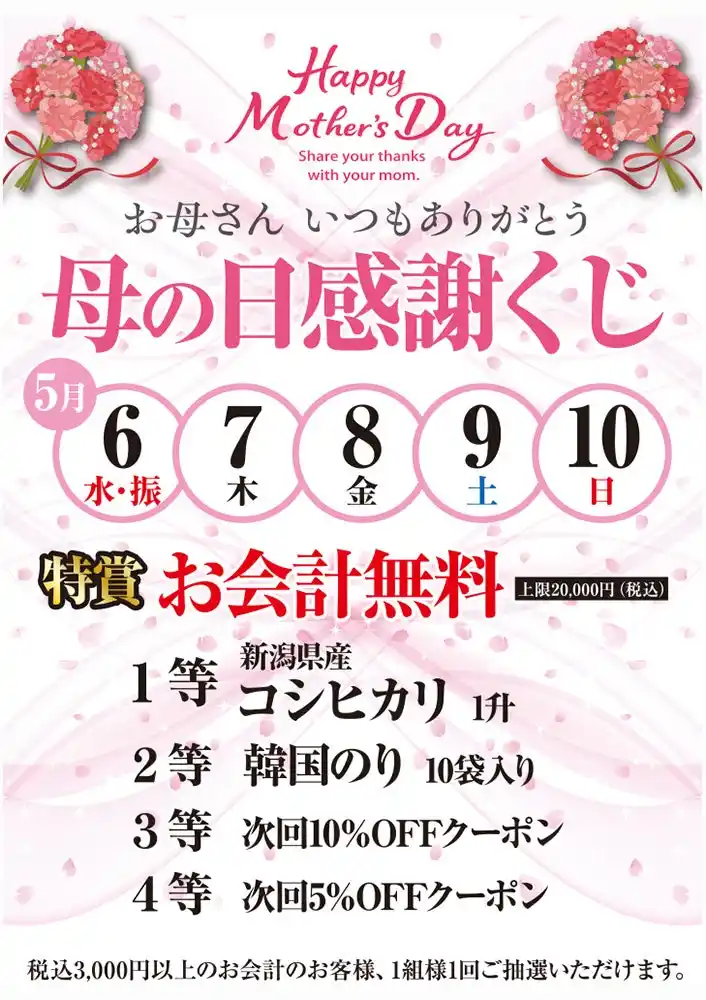 ・1等:新潟県産コシヒカリ1升 各店10本 ・2等:韓国のり10袋入り 各店20本 ・3等:次回10%OFFクーポン ・4等:次回5%OFFクーポン |