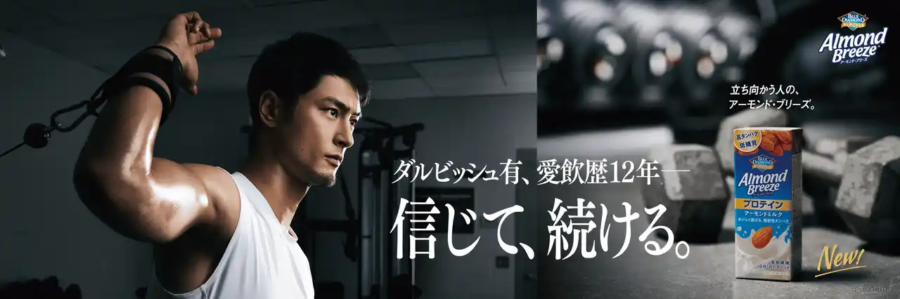 | CM内でダルビッシュ有選手が飲んでいるのは、新商品のプロテインです。アーモンドミルクのおいしさはそのままに、忙しい日常の中でも手軽にたんぱく質補給ができる新しい選択肢として、日々のコンディショニングと、快活で若々しい気分をサポートします。 | ||||||||||