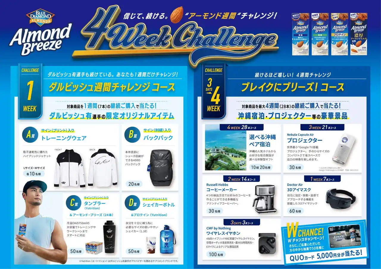 | 7本の購入でダルビッシュ有選手とのコラボレーションによる限定オリジナルアイテムが当たるほか、最大4週間(28本)の購入で沖縄宿泊やプロジェクターなどの豪華賞品が当たるコースにも応募いただけます。アーモンド・ブリーズを楽しみながら、ぜひキャンペーンにご応募ください。 | ||||||||||