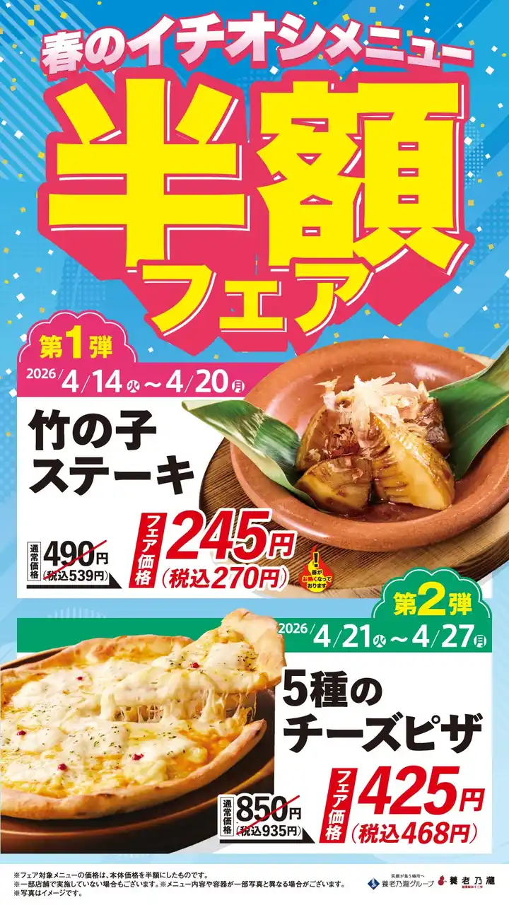 養老乃瀧株式会社(東京都豊島区、代表取締役 矢満田 敏之)は、「養老乃瀧」において行われる2026年4月14日(火)のメニュー改定に伴い、『春のイチオシメニュー半額フェア』を開催いたします。 |