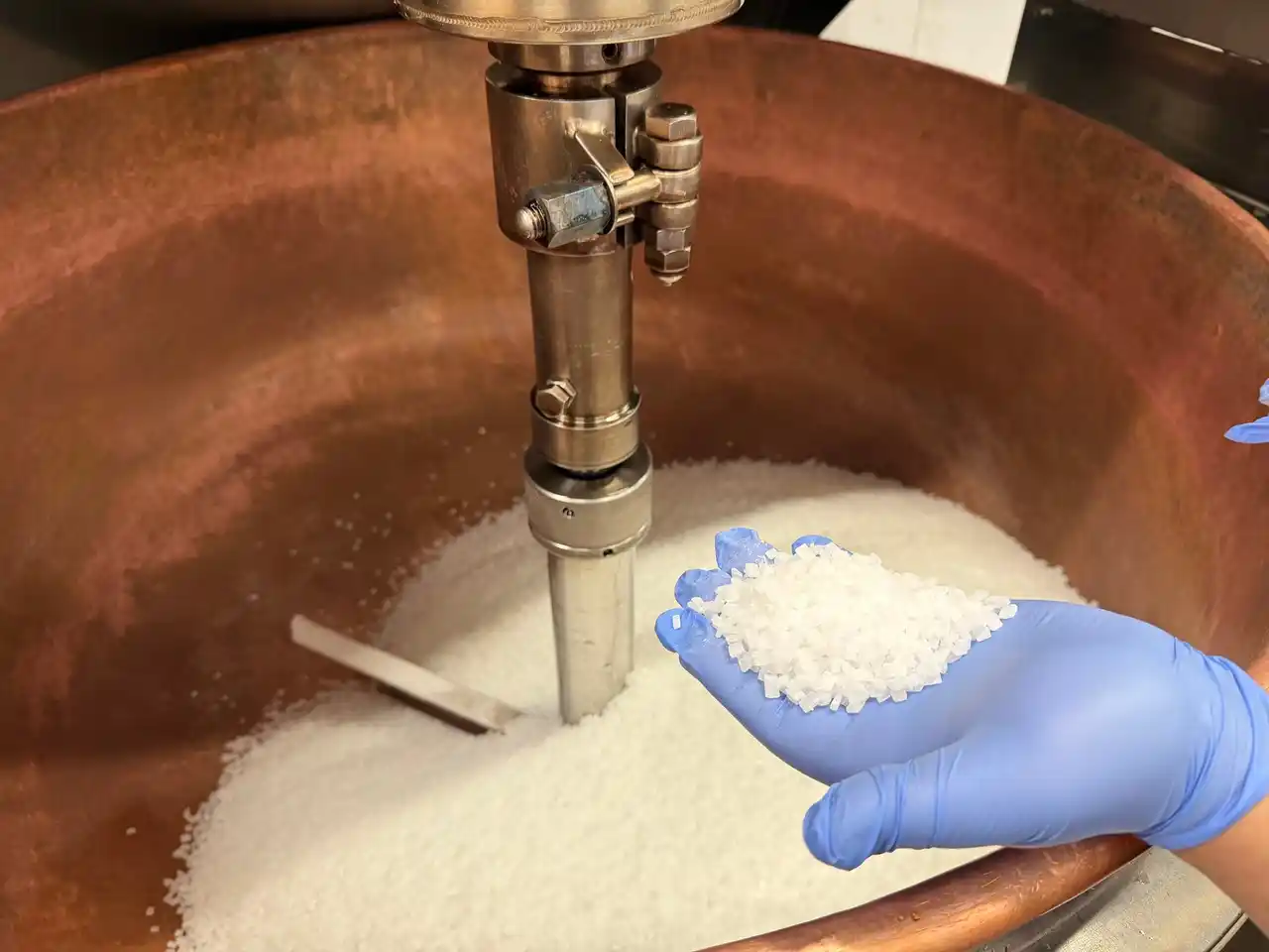 砂糖の成分であるショ糖の精製を繰り返すとショ糖同士が結合して、砂糖の結晶はより大きなものとなります。 製餡に使用する砂糖は、この平均粒径3.7ミリのサイズにまで精製された、透明度の高い最高純度の白ザラ糖である「鬼ザラ糖」を使うことで、一般の砂糖では得られない爽やかな甘みを追及しています。 |