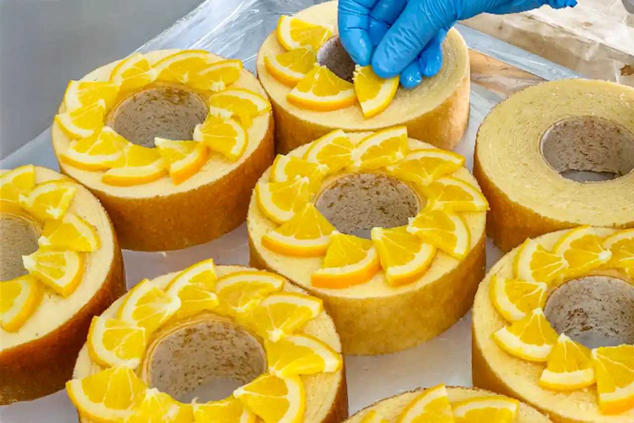 千葉県産米粉を使用したしっとり・もっちり食感が楽しめる、米粉100%のグルテンフリー・バウムクーヘンに、オレンジスライスを華やかに重ねました。その上から、旬のバレンシアオレンジ果汁100%を贅沢に煮詰めた、フルーティーな特製ソースを「これでもか!」というほどたっぷりと。さらにバウムの中心には、甘みと酸味のバランスが絶妙な、濃厚かつ爽やかなチーズクリームを絞り入れました。 |
