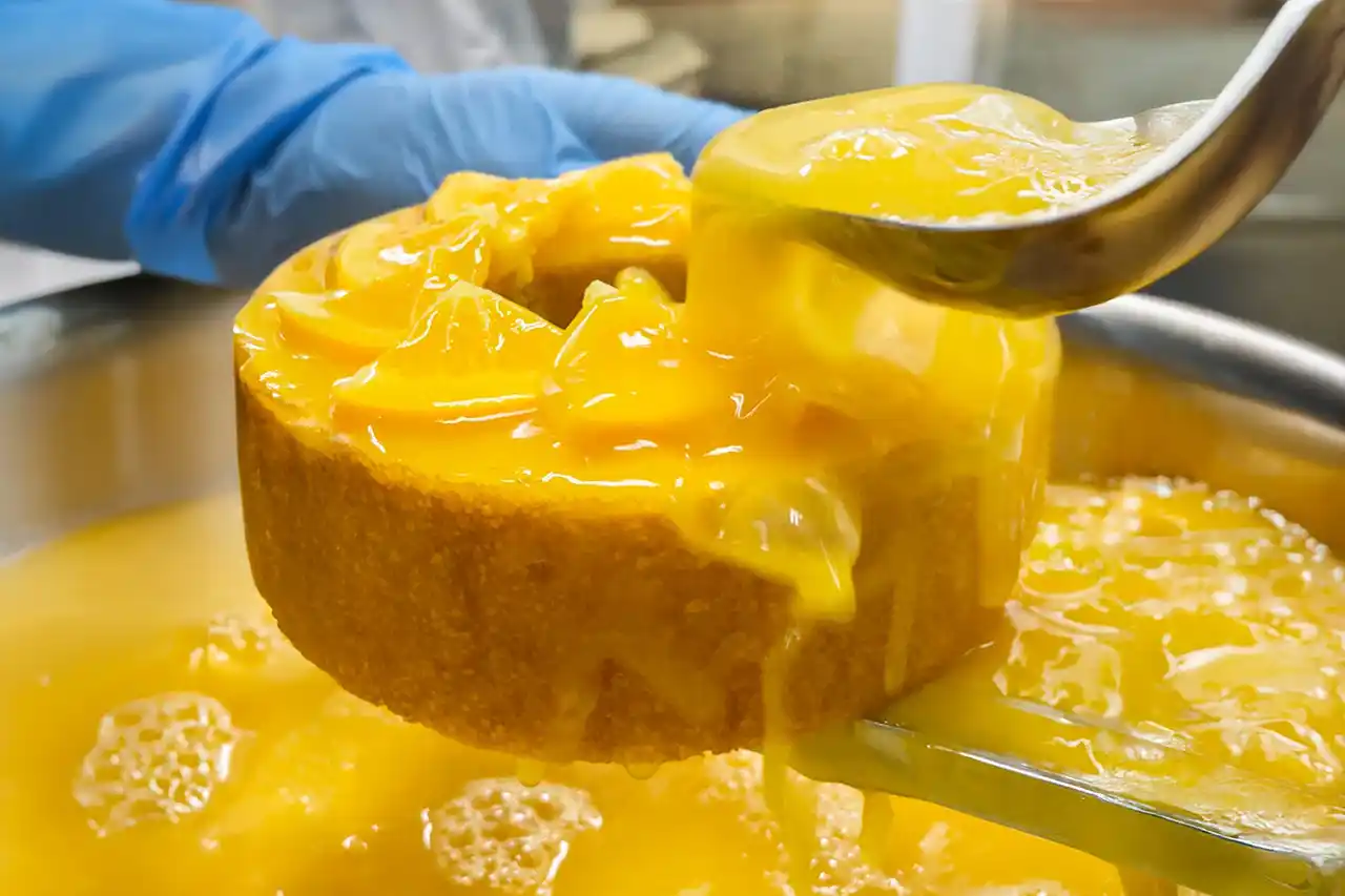 ぎゅっと搾ったみずみずしさをそのまま閉じ込めた、特製のゼリーソース。「こんなにかけていいの!?」と思わず二度見してしまうほど、惜しみなくたっぷりとまわしかけます。 |