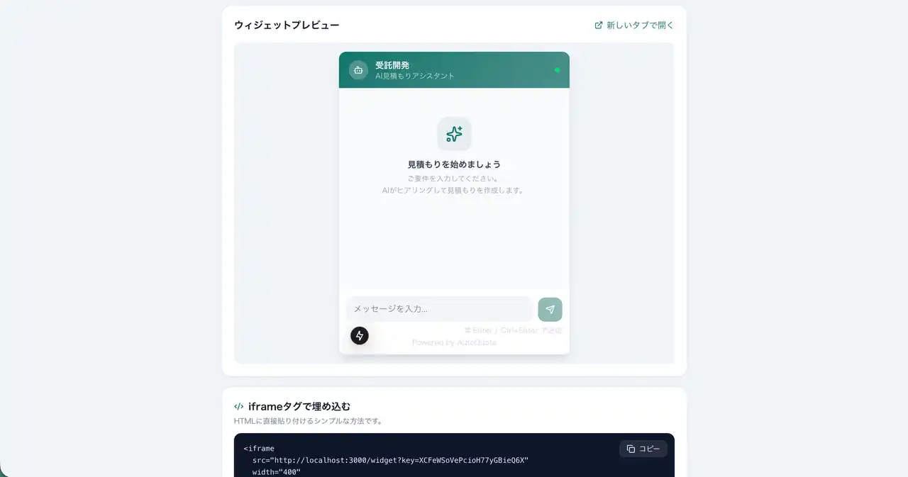 技術的な知識がなくても、最短数分でWebサイトにAI見積もりチャットを導入できます。 |