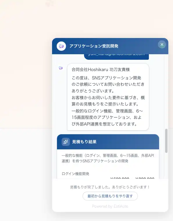 お客様がチャットで要望を入力するだけで、AIが自然な対話を通じて必要な情報を聞き出します。要件を正確に把握した上で、金額の内訳・合計金額・想定期間まで構造化された見積もりをその場で自動生成・提示。24時間365日、即座に対応するため、営業時間外の問い合わせも逃しません。 |