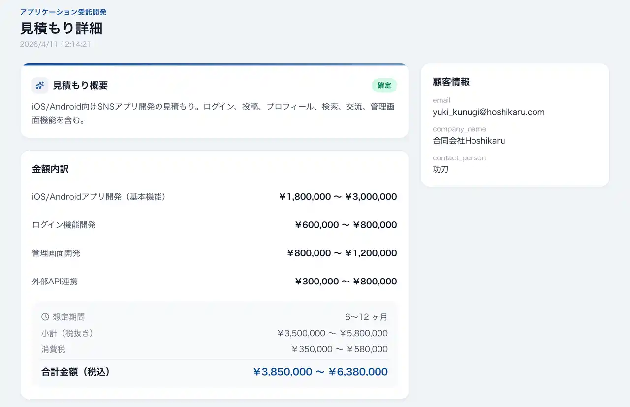AIが自動生成した見積もりの詳細。金額内訳・想定期間・顧客情報をひと目で確認 |