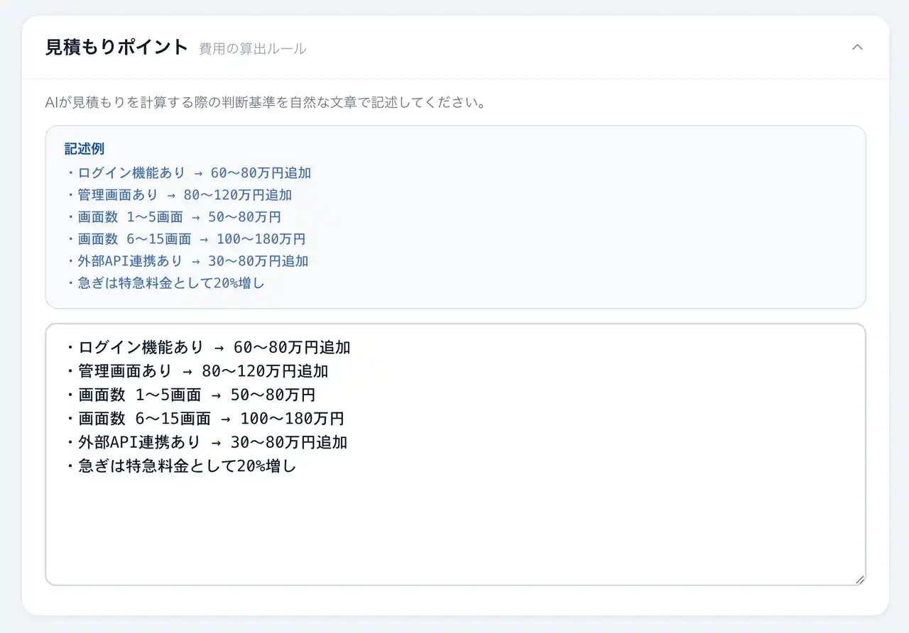 複雑な設定画面やプログラミングは一切不要です。自然な日本語で料金ルールを記述するだけで、AIが自動的にルールを理解し、見積もりに反映します。 設定例: |