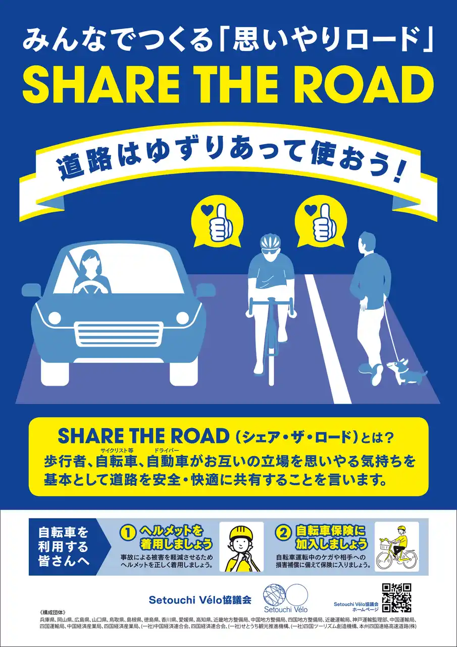 Setouchi Velo協議会(以下「当協議会」)では、歩行者、自転車(サイクリスト等)、自動車(ドライバー)が互いの立場を思いやる気持ちを基本として、道路を安全・快適に共有する『シェア・ザ・ロード』の啓発活動に取り組んでいます。 |