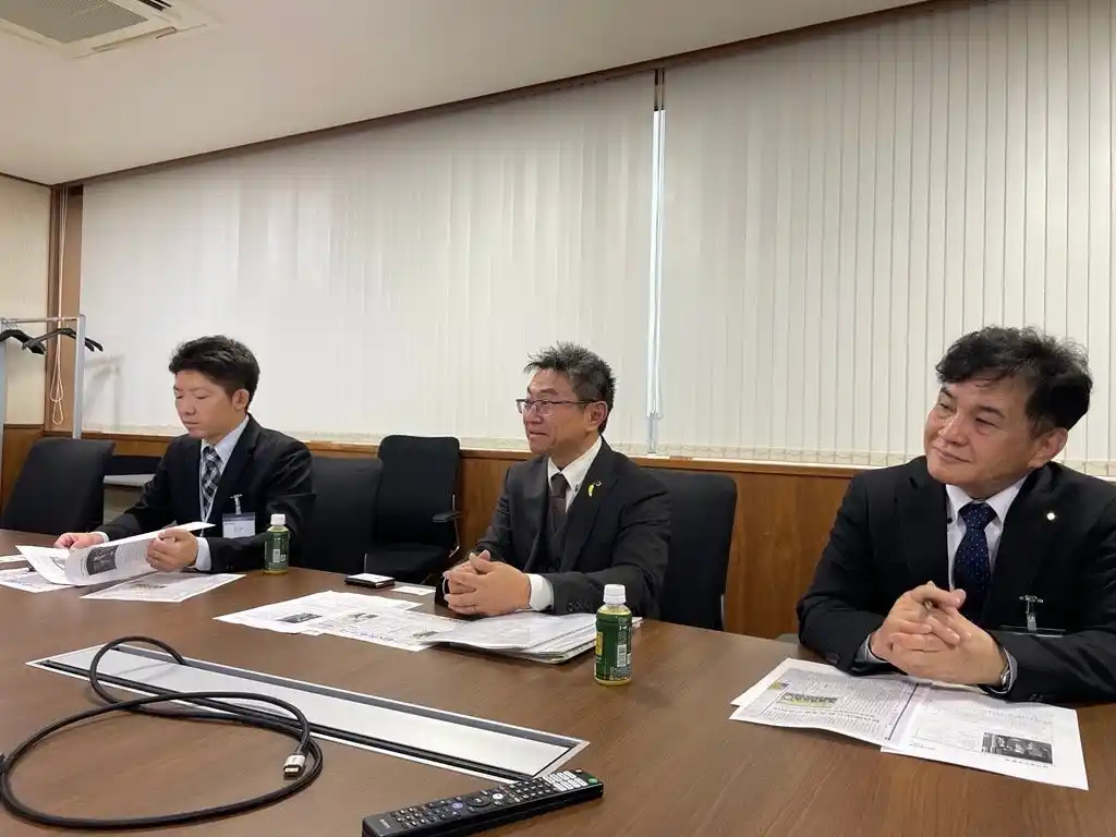 米蔵家 代表取締役 山本様(中央)、知立市商工会 事務局長 早川様(右)、経営指導員 田中様(左)から受賞のご報告(FUJI本社にて) |