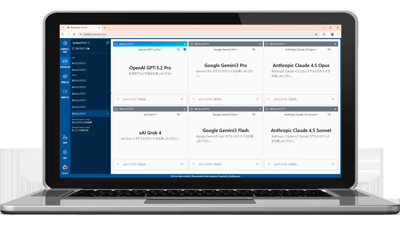 複数LLM同時質問:同じ質問を複数モデルへ並列に投げ、回答を比較検討できる |